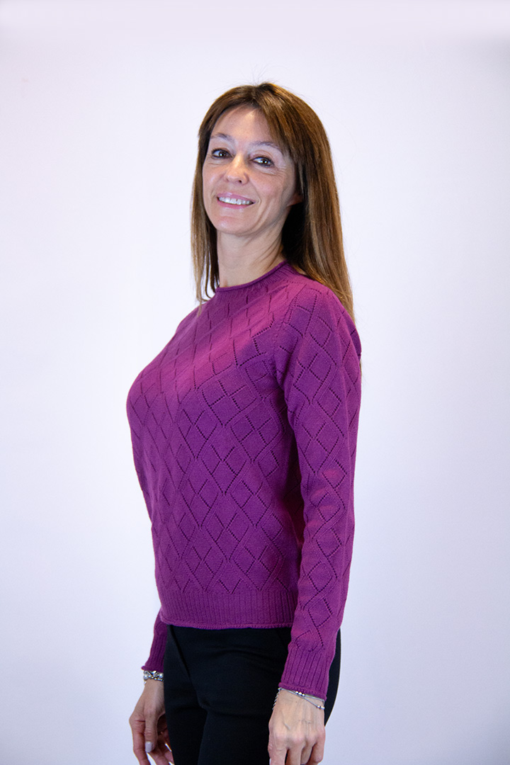 La lunghezza ai fianchi e la vestibilità morbida valorizzano con naturalezza la figura femminile. Il girocollo con lavorazione a costina sottolinea con eleganza il collo, mentre il motivo traforato a rombi dona luce e movimento, creando un raffinato gioco di trasparenze.